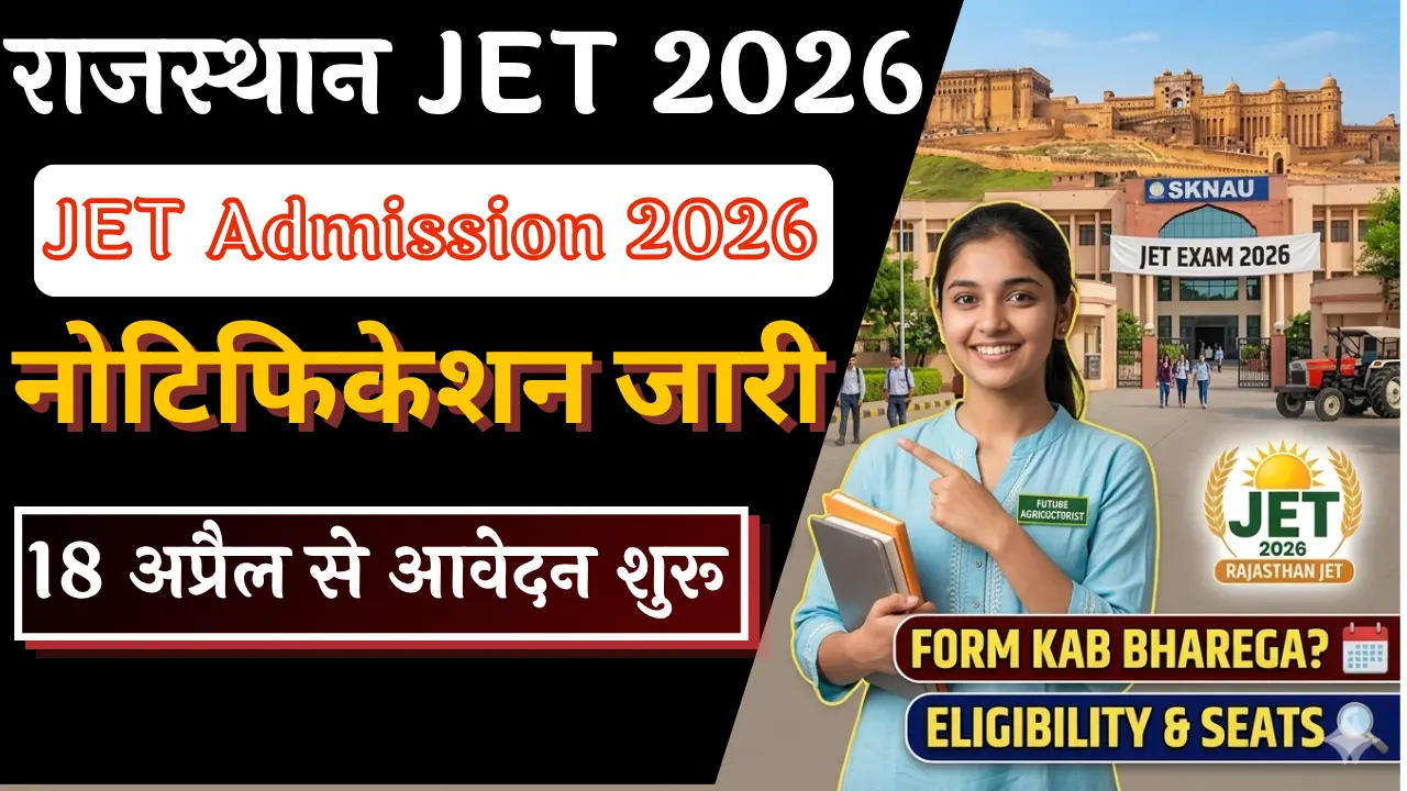 Rajasthan JET Admission Notification 2026: राजस्थान जेट (Joint Entrance Test) 2026 का आधिकारिक नोटिफिकेशन जारी कर दिया गया है।राजस्थान के प्रतिष्ठित कृषि विश्वविद्यालयों और निजी संस्थानों में स्नातक पाठ्यक्रमों जैसे B.Sc (Agriculture), Horticulture, Forestry, Dairy, Fisheries आदि ऐसे कोर्स में प्रवेश पाने के लिए जेट (JET) परीक्षा का आयोजन करवान जाता है। आसान शब्दों में कहे तो इसके माध्यम से राज्य के सरकारी और निजी कृषि महाविद्यालयों में दाखिला दिया जाता है।