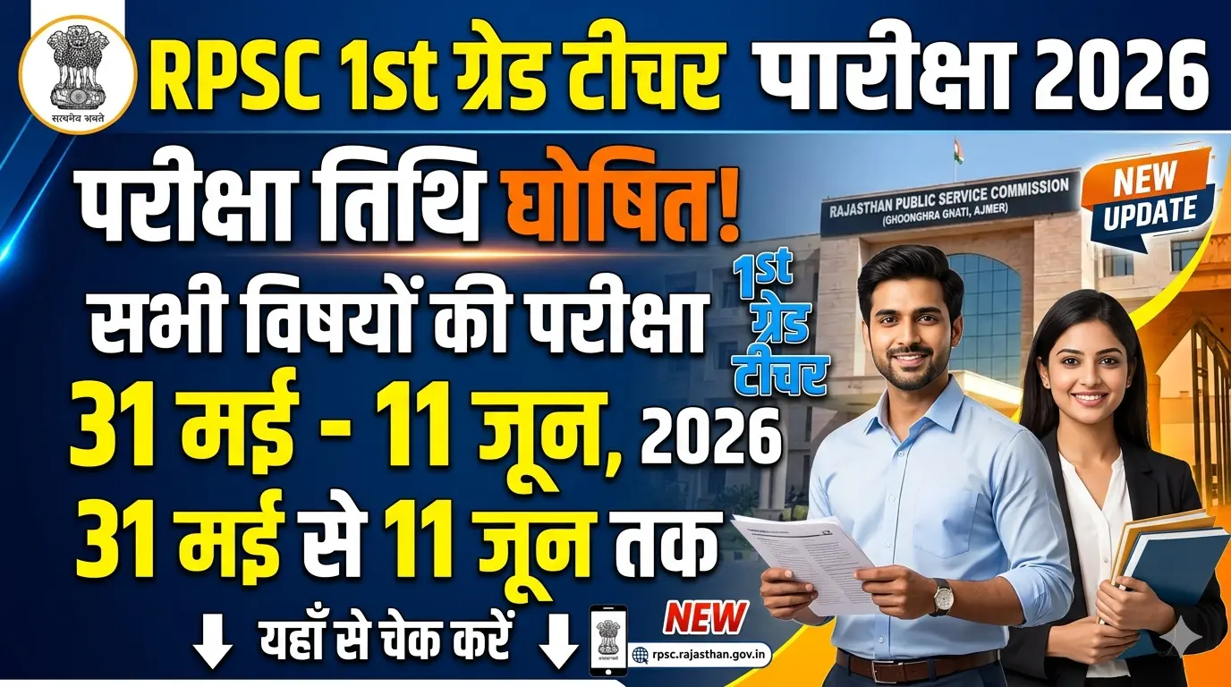 RPSC 1st Grade Teacher Exam 2026 Update: राजस्थान में 1st ग्रेड शिक्षक बनने का सपना देख रहे लाखों अभ्यर्थियों के लिए एक महत्वपूर्ण अपडेट सामने आया है। राजस्थान लोक सेवा आयोग (RPSC) ने स्कूल व्याख्याता (1st Grade Teacher) भर्ती परीक्षा 2026 की आधिकारिक तिथियां घोषित कर दी हैं। आयोग द्वारा जारी नोटिस के अनुसार, परीक्षा का आयोजन 31 मई 2026 से 11 जून 2026 के बीच किया जाएगा। यह भर्ती कुल 3,225 पदों पर की जा रही है।दि आपने भी इस भर्ती के लिए आवेदन किया है, तो अब आपकी मेहनत को अंतिम रूप देने का समय आ गया है।